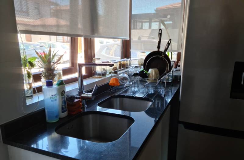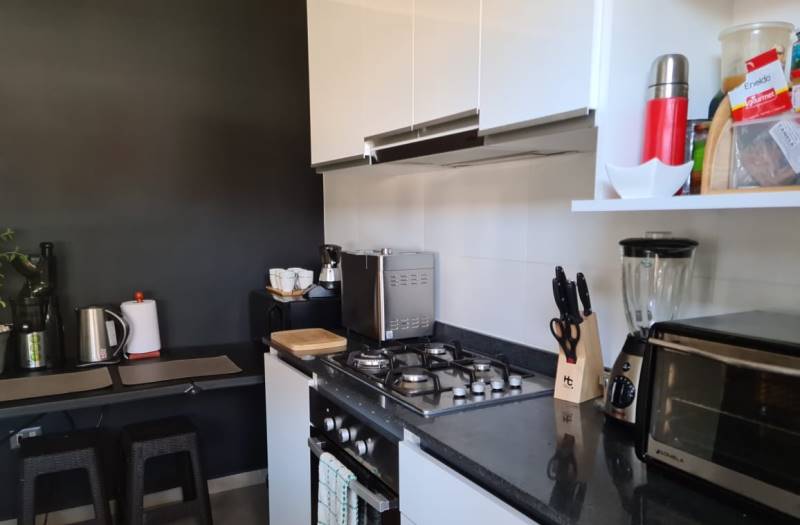 -COCINA TOTALMENTE AMOBLADA Y EQUIPADA CON CUBIERTA DE GRANITO Y LAVAPLATOS DOBLE, CONEXIÓN PARA LAVAVAJILLAS.